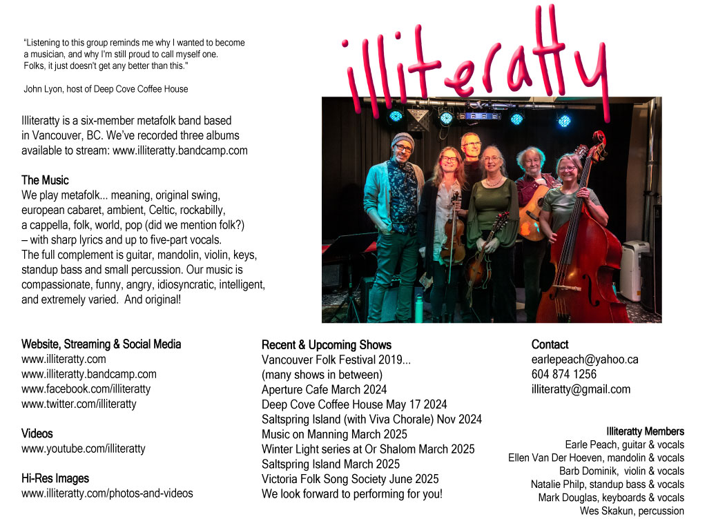 “Illiteratty have a wonderful and dynamic musical sound that brought everyone to theit feet for a standing ovation at the Jericho Folk Music Club.Great harmonies, playful and original arrangements that delighted and entertained the audience.Songwriting that connected us to each other. Would we book them again? In a heart beat!”